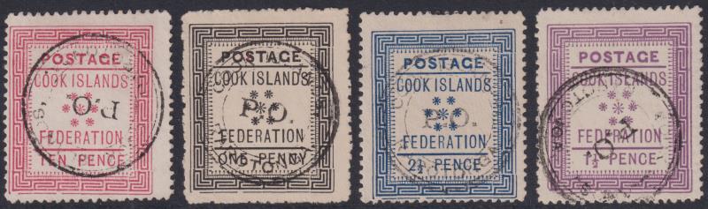 Cook Isl 1892 1d-10d Federation set of 4, Cook Isl PO (etc) circular undated pmks in black. SG 1-4. Cat £225. FU. (Image)