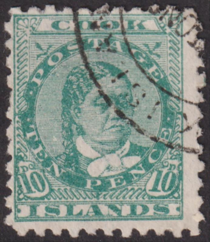 Cook Isl 1896 10d Makea green, p11. SG 19. Cat £55. FU. (Image)