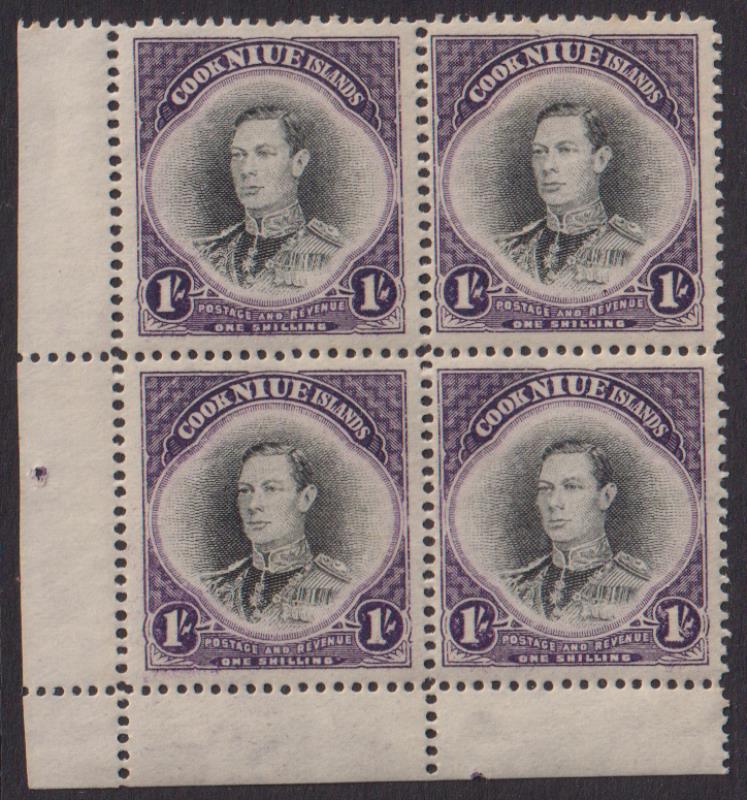 Niue 1938 1/- GVI corner block of 4, single wmk. SG 75. Cat £72. Fresh MUH. (Image)