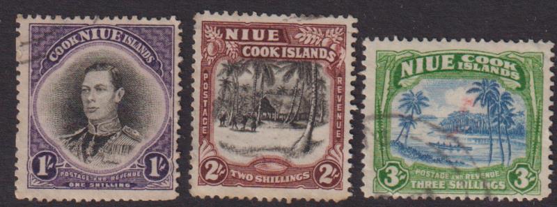 Niue 1938 1/-, 2/- & 3/- Pictorials set. SG 75-7. Cat £50. FU. (Image)