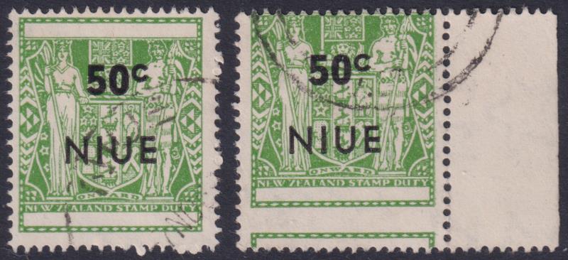 Niue 1967 50c Arms ovpt stamp, design (but not ovpt) shifted 4mm upwards with RH selvedge. Spectacular error (with normal).