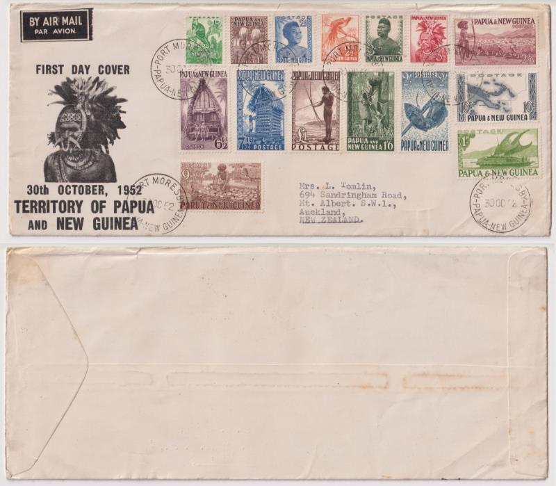 2469 C imagePNG 1952 Pictorials original set of 15 (no 3½d black) on large pictorial typed addressed FDC. Port Moresby 30 OCT cds. Not often seen. (Image)