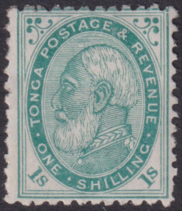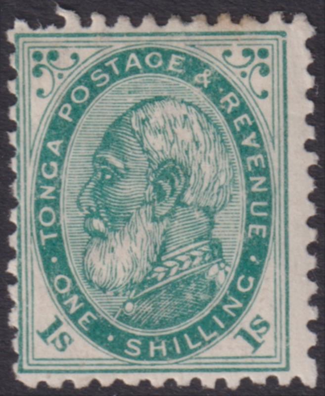 Tonga 1888 1/- King George I deep green, p12 x 11½, type 1 (normal). SG 4ba. Cat £80. Mint. (Image)