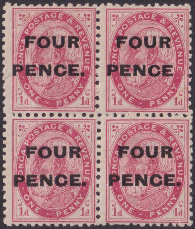 Tonga 1891 4d on 1d King George I carmine block of 4, with 2nd stamp having no stop after PENCE (2 light hinge stamp with vertical