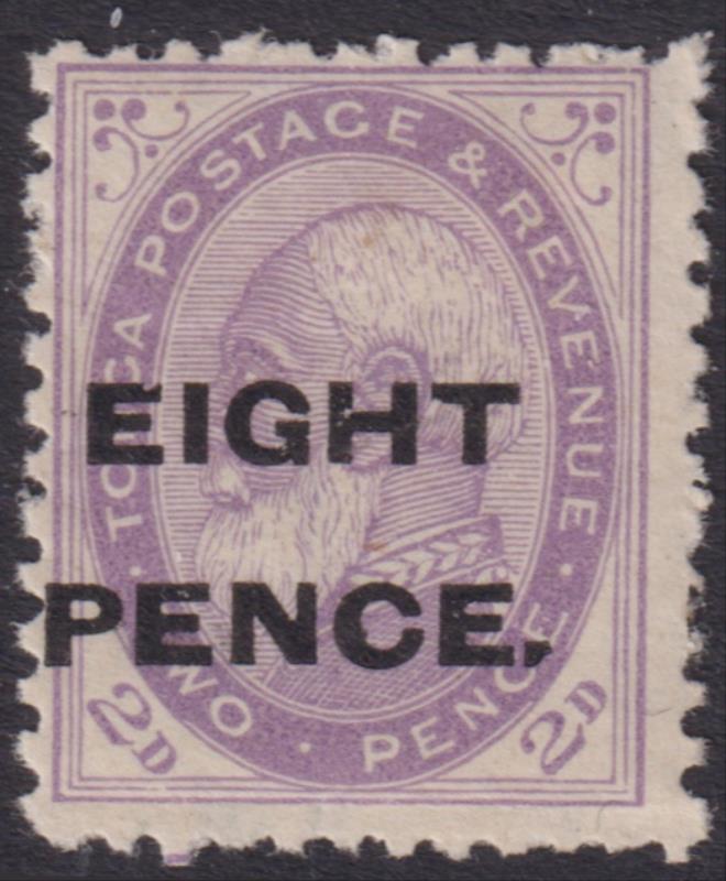 Tonga 1891 8d on 2d King George I violet, type 4 (oval broken under "TW" of "TWO" & also under "CE" of "PENCE"). SG 6. Cat £50.