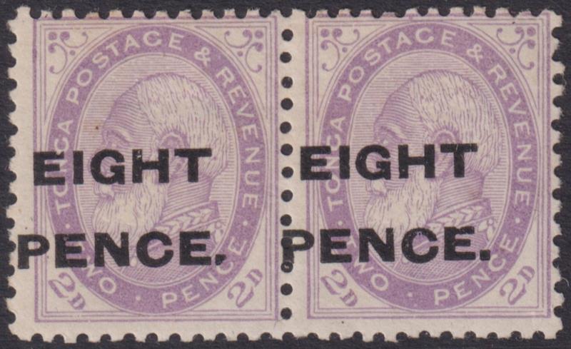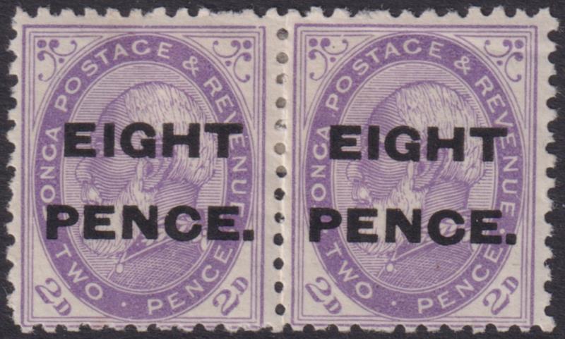 Tonga 1891 8d on 2d King George I violet horiz pair, both type 4 (oval broken under "TW" of "TWO" & under "CE" of "PENCE"). SG 6.