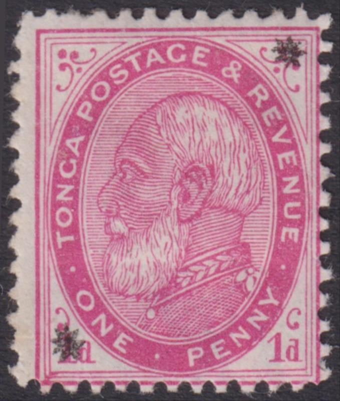 Tonga 1891 1d King George I carmine, stars ovpt, type 3 (oval broken under "NY" of "PENNY"). SG 7. Cat £55. Mint. (Image)