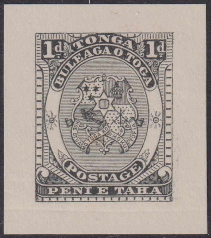 Tonga c1892 1d Arms, 26mm x 30mm, die proof in black, on unwatermarked paper. (Image)