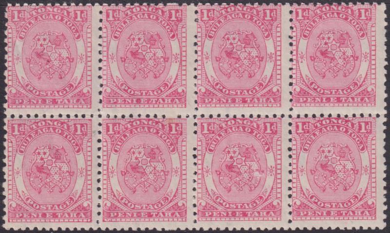 Tonga 1892 1d Arms bright rose horiz block of 8, p12 x 11½, minor h/s on 1, otherwise fresh. SG 10a. Cat £176 as mint. MUH. (Image)