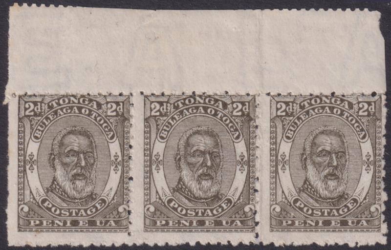Tonga 1892 2d King George I olive horiz strip of 3, with partly perforated upper selvedge with "EALA" double letters wmk. SG 11.