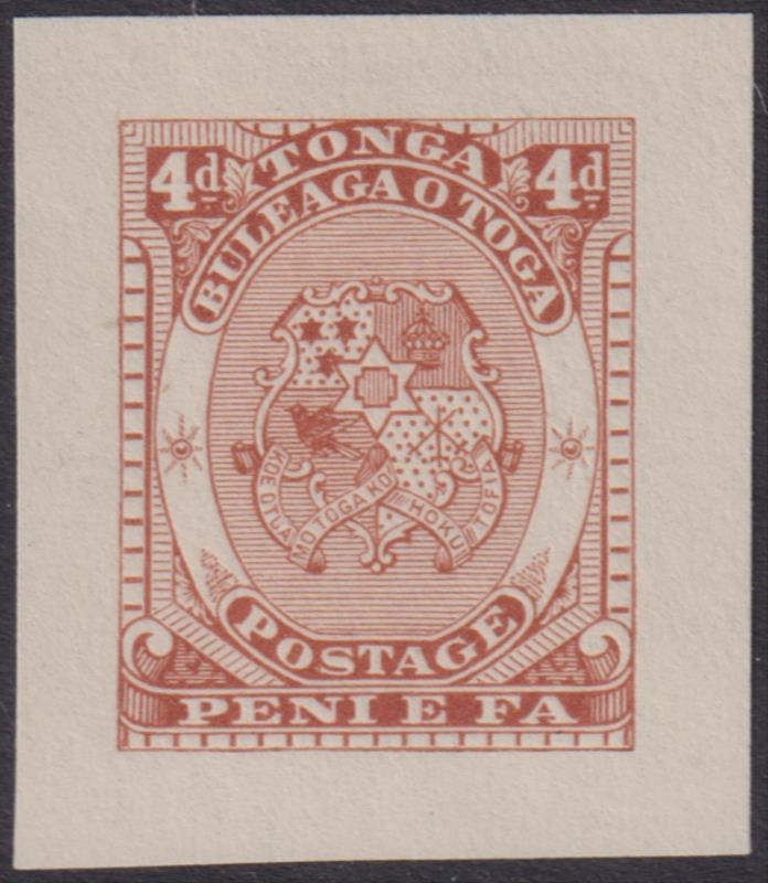 Tonga c1892 4d Arms chestnut, 25mm x 30mm, die proof, on unwmkd paper. (Image)