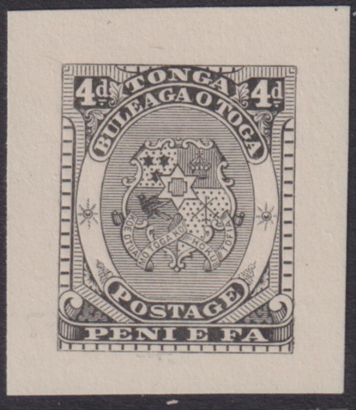 Tonga c1892 4d Arms black, 25mm x 30mm, die proof, on unwmkd paper. (Image)