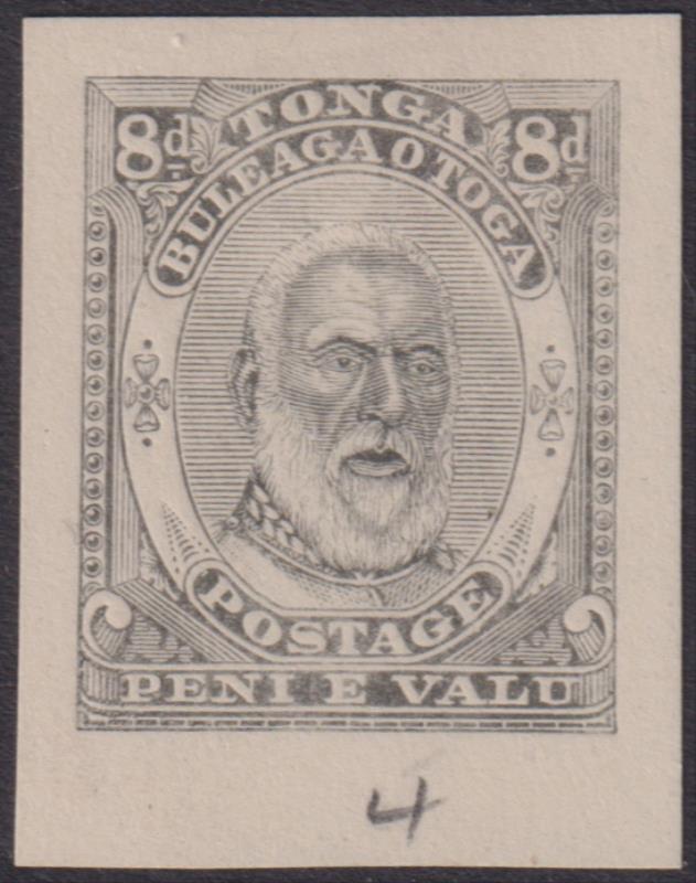 Tonga c1892 8d King George I grey, 21.5 x 28mm, die proof, on unwmkd paper, with "4" in pencil annotated at base. (Image)