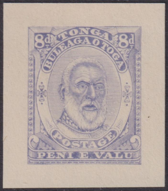 Tonga c1892 8d King George I blue, 25mm x 29mm, die proof, on unwmkd paper. (Image)