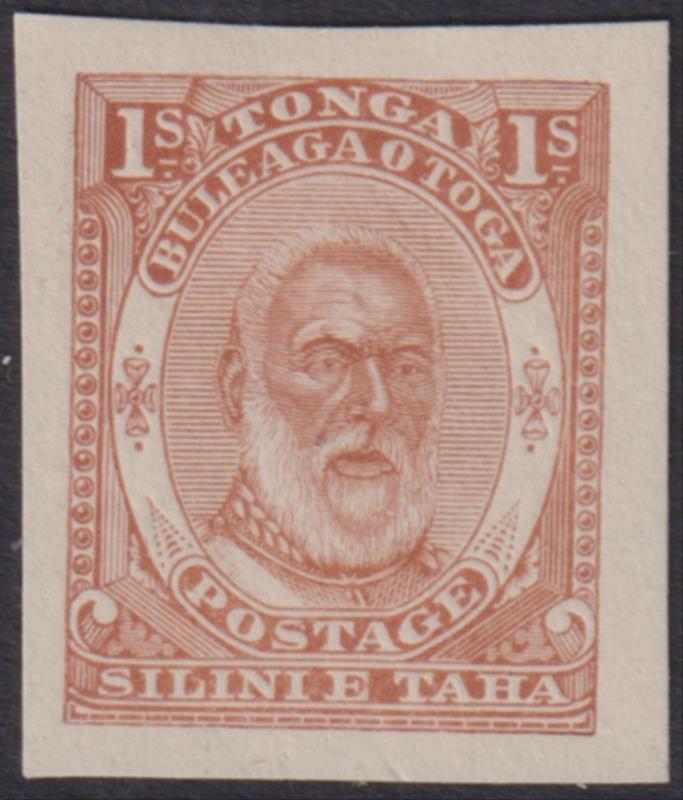 Tonga c1892 1/- King George I chestnut, 21.5 x 25mm, die proof, on unwmkd paper. (Image)