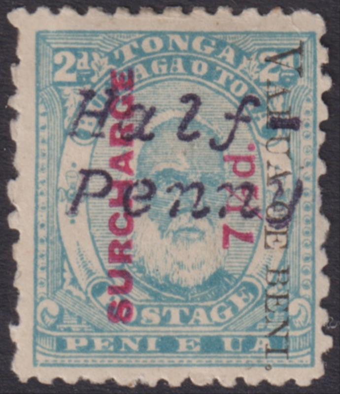 Tonga 1896 ½d on 7½d on 2d King George I pale blue, p12 x 11, "HALF PENNY" shifted to right so apparently hyphen missing. Tongan