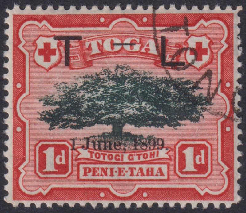 Tonga 1899 1d Royal Wedding (Ovava tree ovpt "1 JUNE 1899 T-L''). SG 54. Cat £70. VFU. (Image)