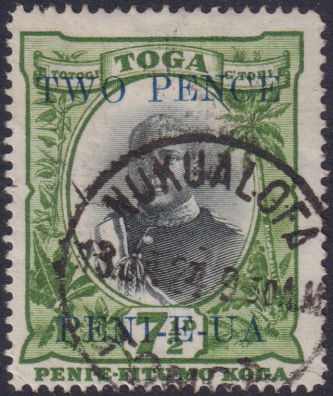 Tonga 1923 2d on 7½d King George II, upright tortoises wmk. SG 65. Cat £55. FU. (Image)