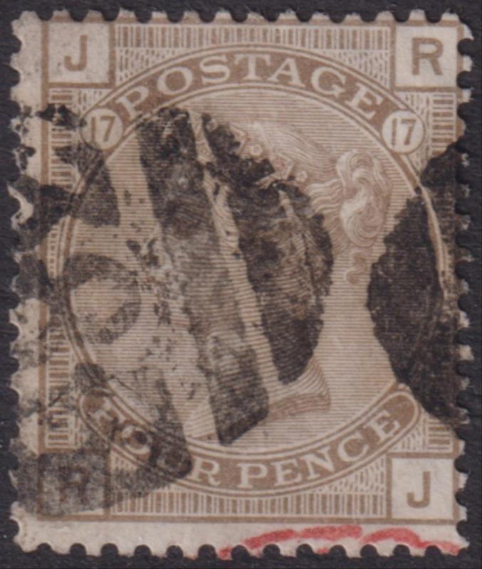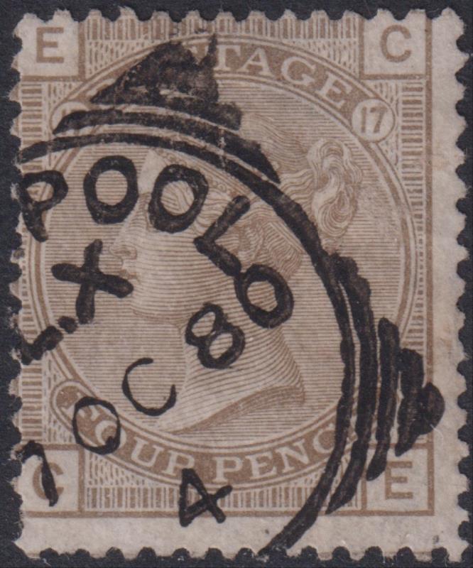 1880 4d grey-brown, plate 17, large garter wmk. SG 154. Cat £400. GU. (Image)