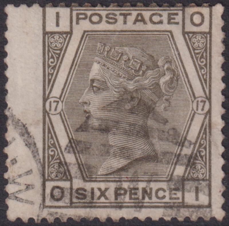 1880 6d grey (IO/OI), large coloured corner letters, scarce plate 17, rose spray wmk. With wing margin at left. SG 147. Cat