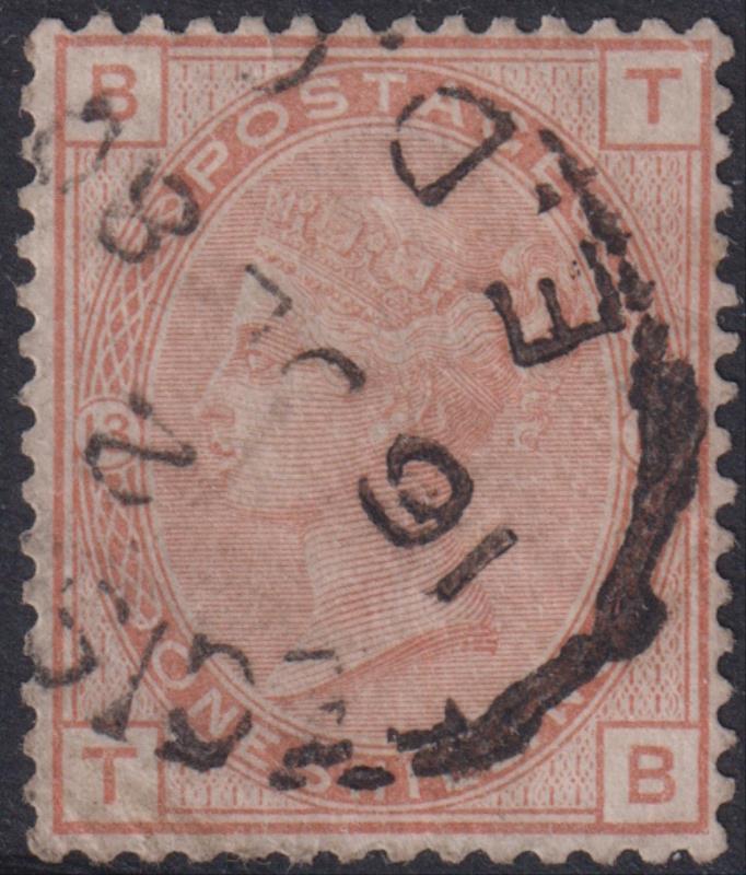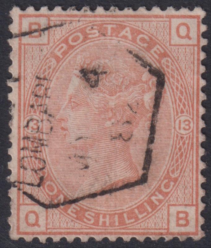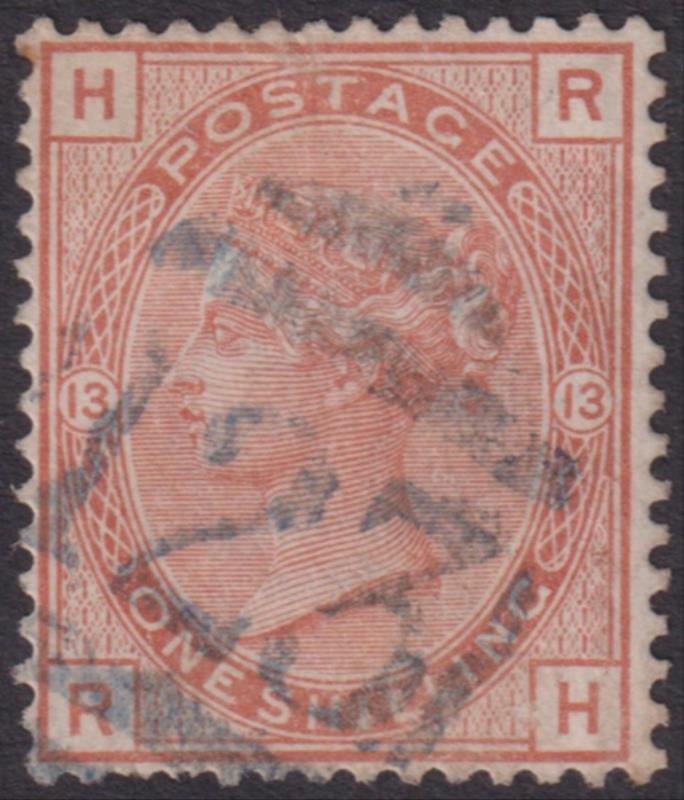 1881 1/- orange-brown, large coloured corner letters, plate 13, large crown wmk, obliterator "123" cancel. SG 163. Cat £80.