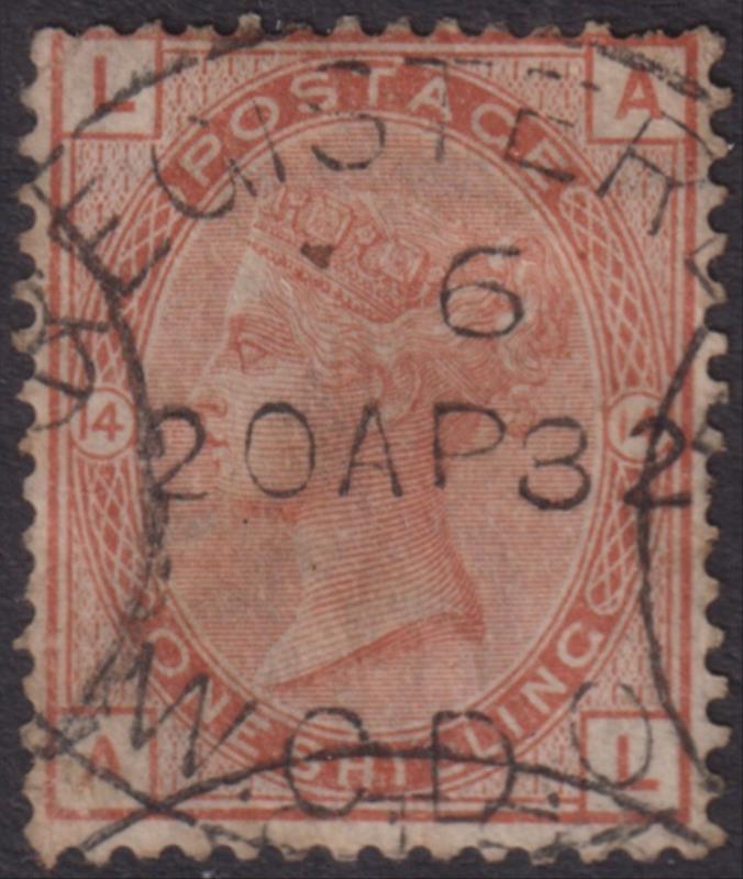 1881 1/- orange-brown, large coloured corner letters, plate 14, large crown wmk, light steel cds. SG 163. Cat £80. FU. (Image)