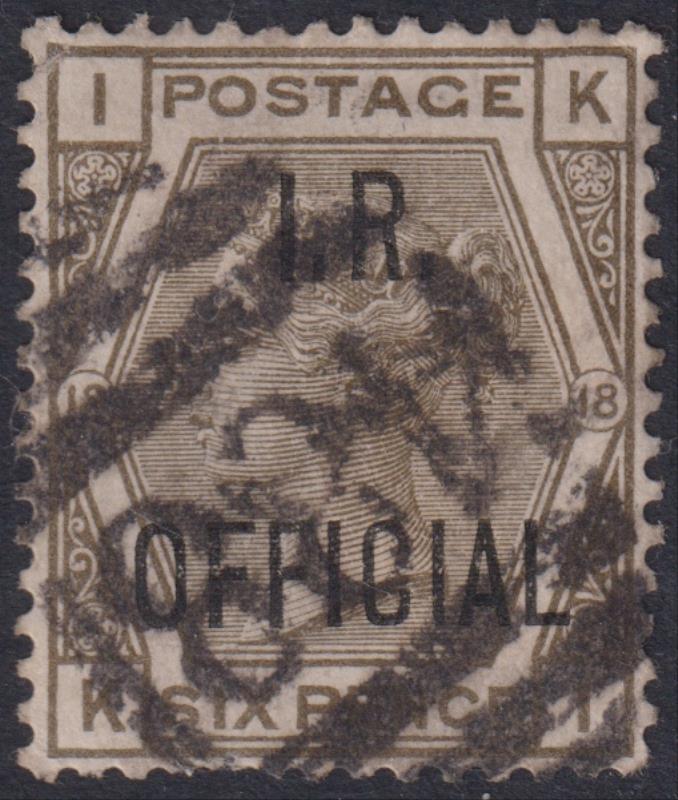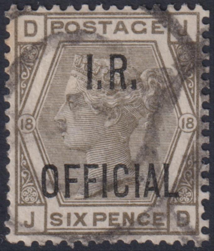 1882 6d grey (JD), plate 18, "I.R. OFFICIAL". SG O4. Cat £75. GU/FU. (Image)