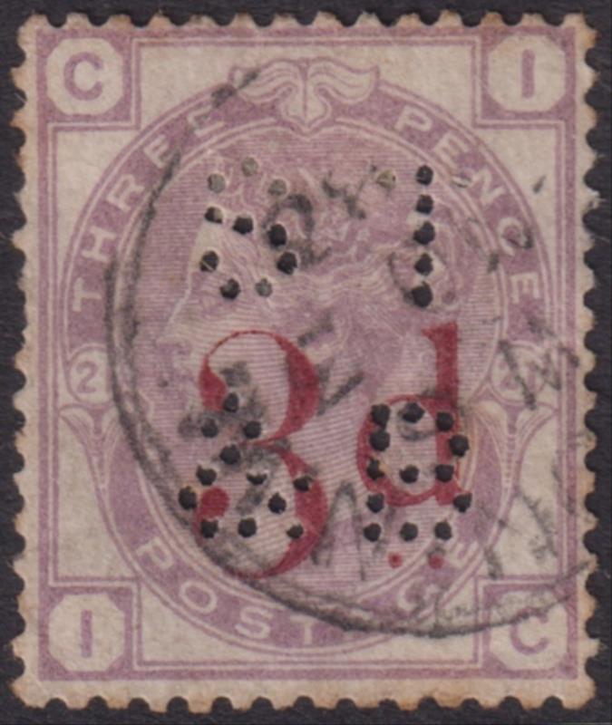 1883 2d on 3d lilac, large coloured corner letters, large crown wmk, with perfin "S1 / &B". SG 159. Cat £75. FU. (Image)
