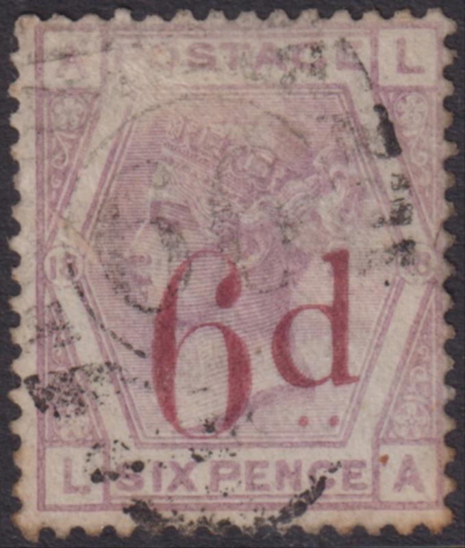 1883 6d on 6d lilac. SG 162. Cat £75. GU/FU. (Image)