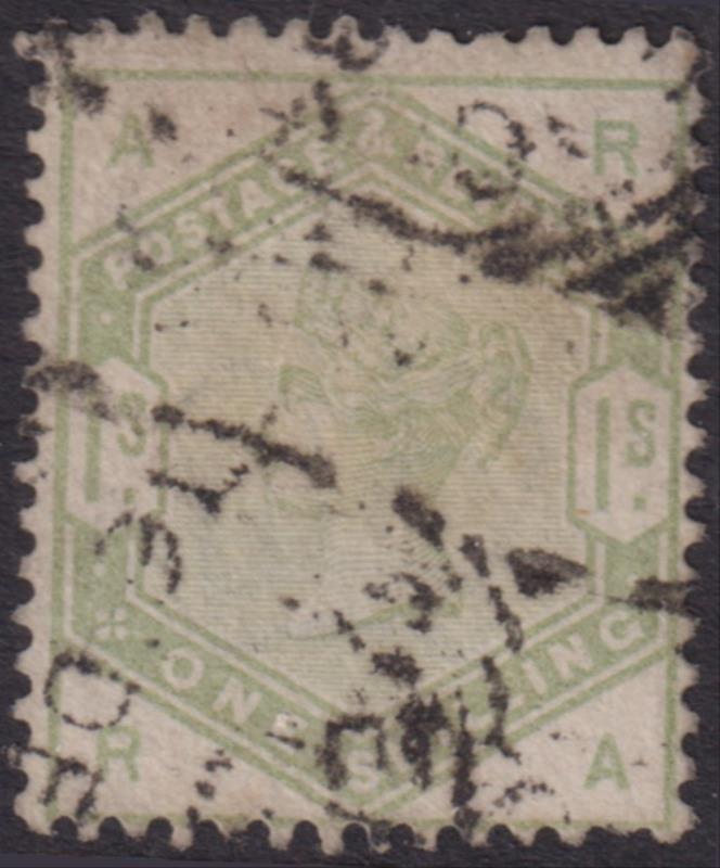 1883 1/- dull green, steel d/s but small heavy patch. SG 196. Cat £150. GU. (Image)