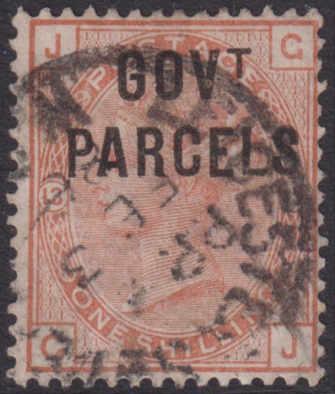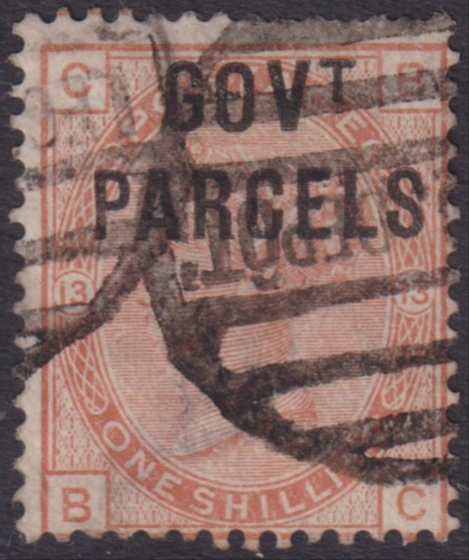 1883 1/- orange-brown (BC), plate 13, GOVT. PARCELS, back thin. SG O64. Cat £180. GU. (Image)
