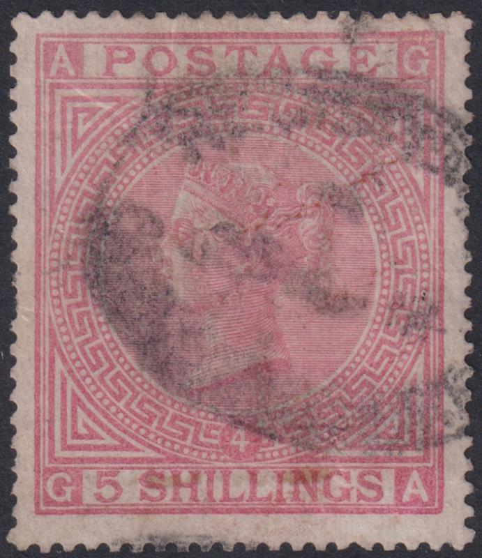 1883 5/- rose white paper, large uncoloured letters, anchor wmk, minor faults. SG 134. Cat £2000. Used. (Image)