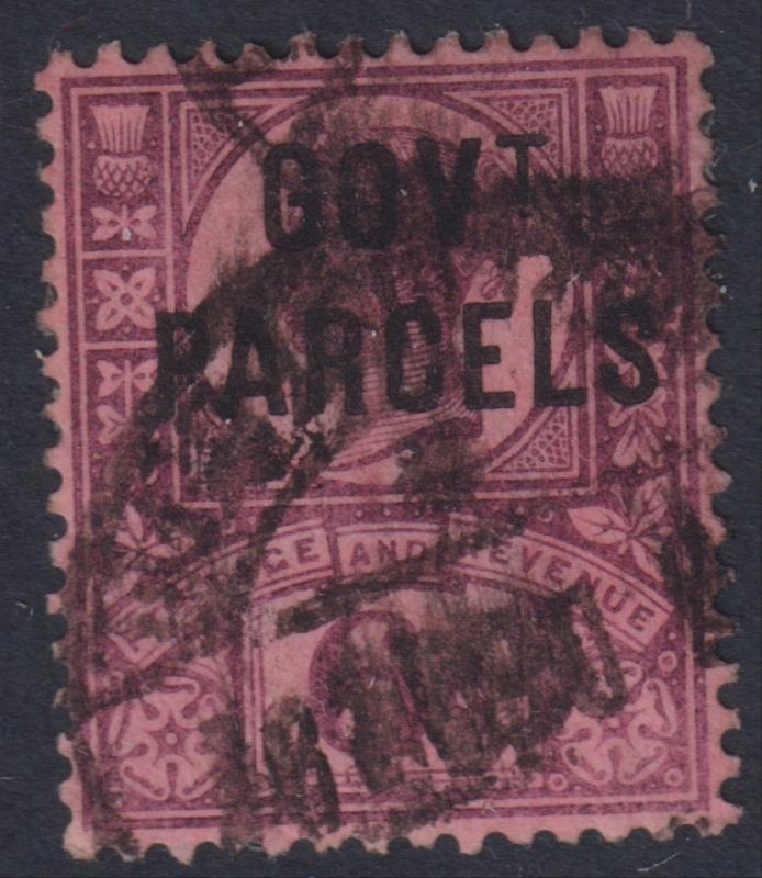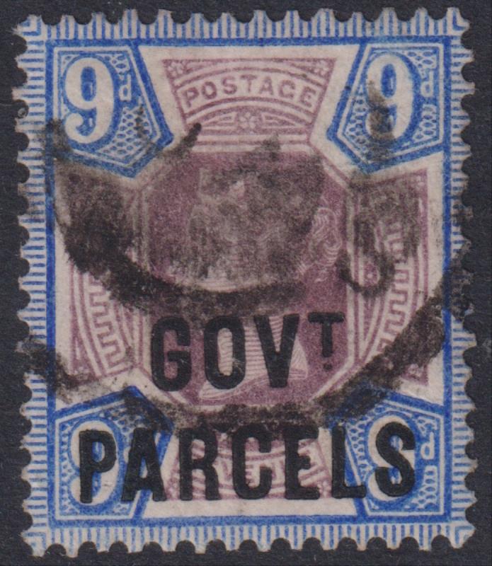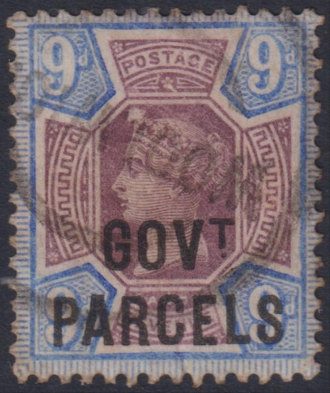 1888 9d dull purple & blue, GOVT PARCELS ovpt, parcel pmk. SG O67. Cat £50. GU. (Image)