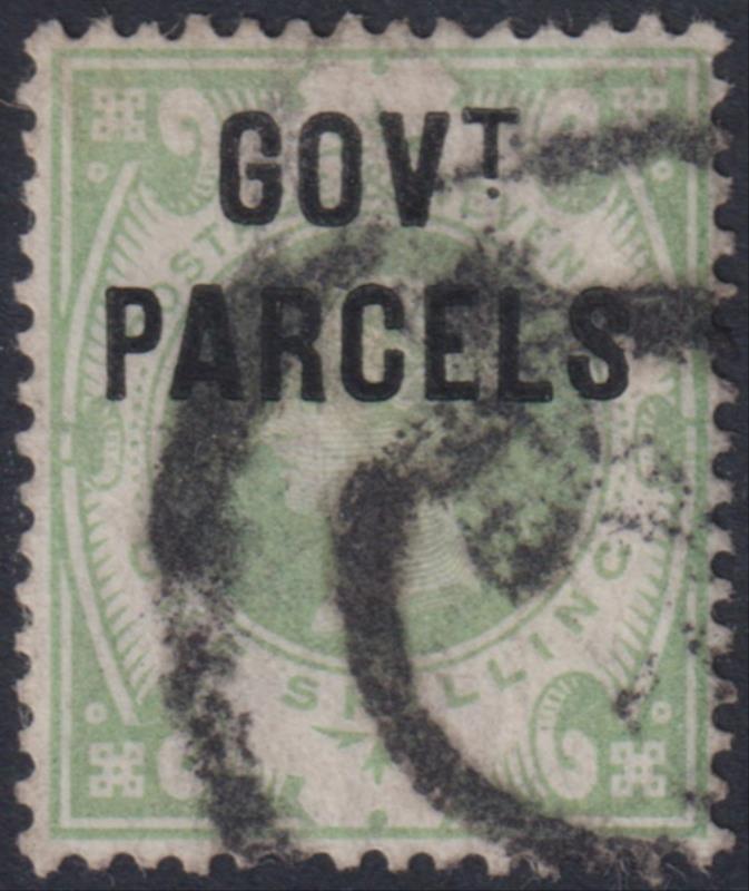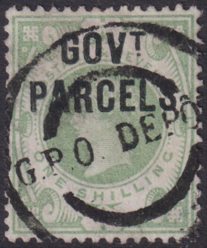 1890 1/- dull green, GOVT PARCELS ovpt. SG O68. Cat £150. FU.