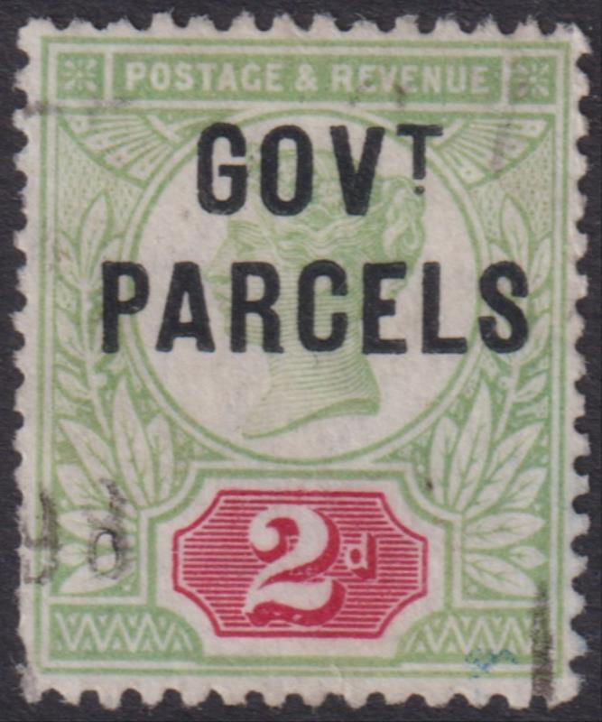1891 2d grey-green & carmine (rather faded), GOVT PARCELS ovpt. Several short perfs at left. SG O70. Cat £30. FU. (Image)