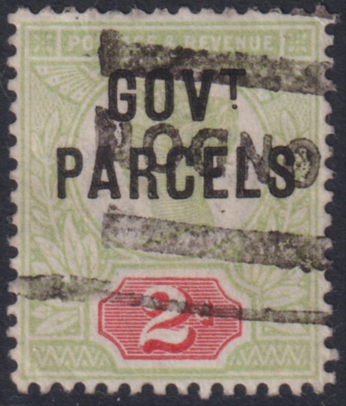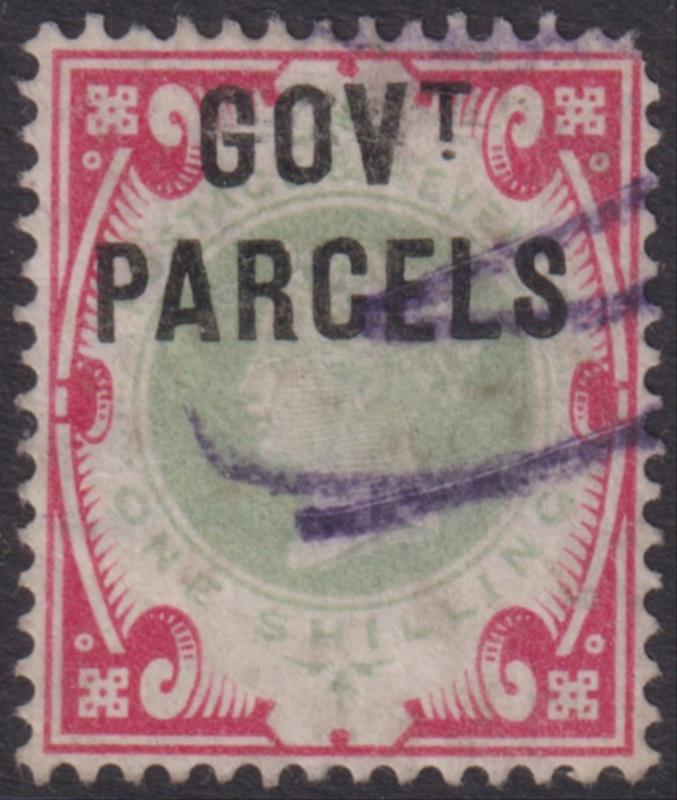 1900 1/- green & carmine (faded), GOVT PARCELS ovpt, top RH corner rounded, indelible pencil cancel. SG O72. Cat £225. GU. (Image)