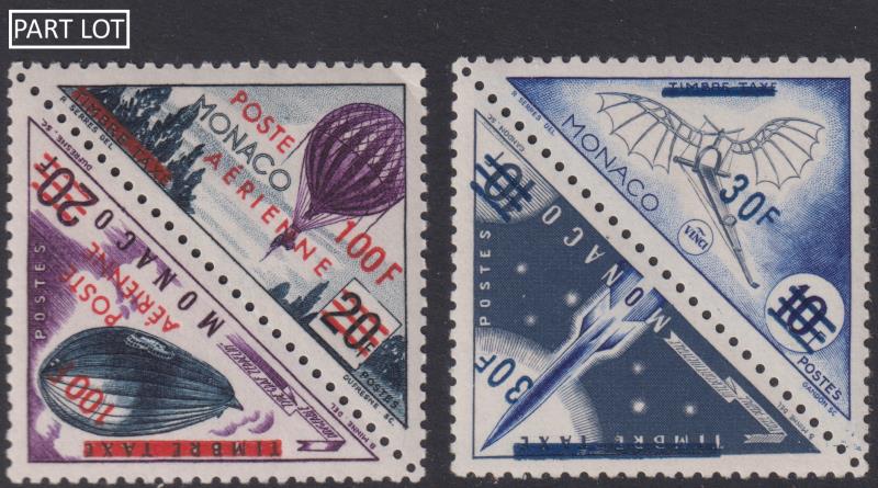 Aviation: Monaco 1956 2F-100F postage ovpts on triangular 1953 Postage Dues. Seven diff setenant pairs with aviation theme: 2F,