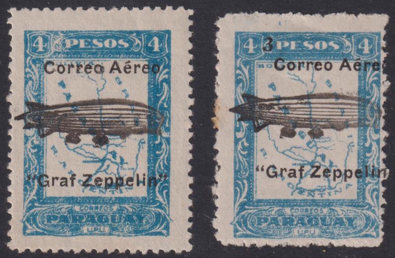 Aviation: Paraguay 1931 "Correo Aereo/Graf Zeppelin" pictorial ovpt set of 2 (with image of airship): a) on 1924 4P Map pale blue;