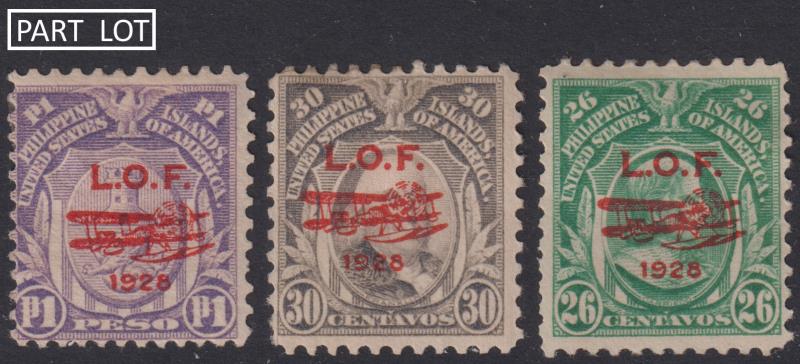 Aviation: Philippines 1928 2c-1P Airmail London-Orient Flight ovpts ("L.O.F."/biplane/1928") set of 11 (12c with back thin).