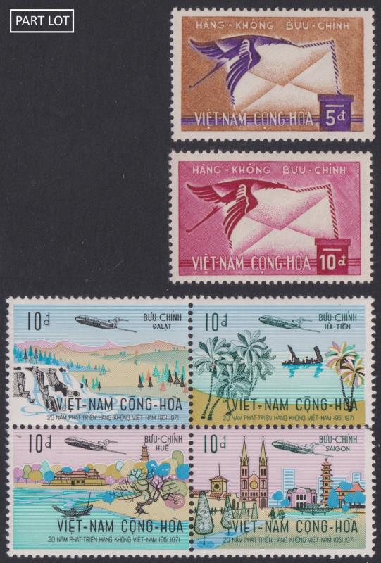 Aviation: Vietnam-South 1972 Vietnam Airlines 20th Anniv set of 8 in 2 setenant blks of 4 (10p, 25p) MUH. Also 1960 Air (flying