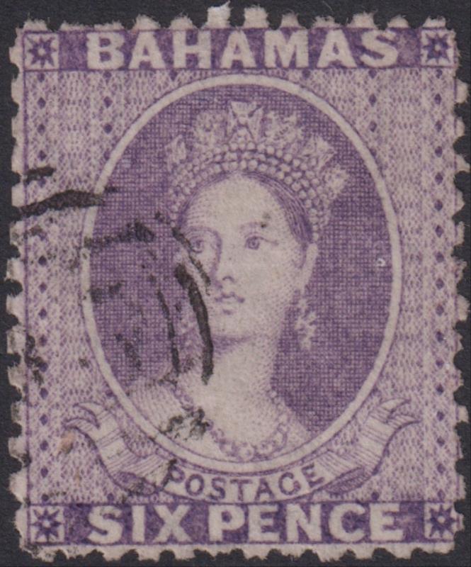 2813 U imageBahamas c1870s 6d QV lilac, p12½, crown CC wmk, with partial double-lined letters wmk at top (intended for selvedge). SG 30. Cat £75. FU. (Image)