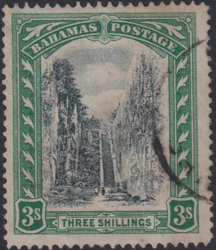 2814 U imageBahamas 1917 3/- Queen's Staircase black & green, p14, wmk mult crown CA. Light diagonal crease visible on back & light soiling 1 corner. SG 80. Cat £60. FU. (Image)