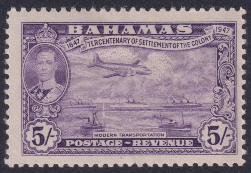 2816 M imageBahamas 1948 5/- GVI transportation mauve. SG 191. Cat £20. LH mint. (Image)