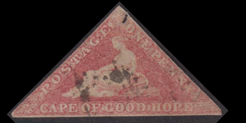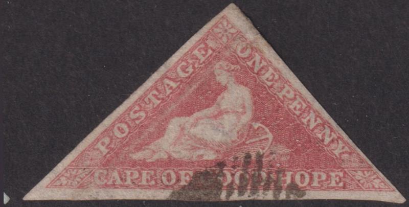 2891 U imageCape of Good Hope 1855 1d triangular rose, on cream toned paper, imperf 3 margins (just to small), small nick to right of apex. SG 5a. Cat £300. FU. (Image)
