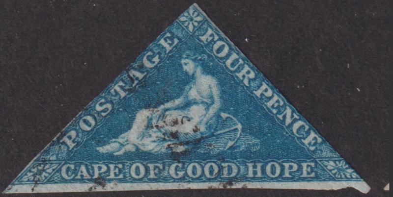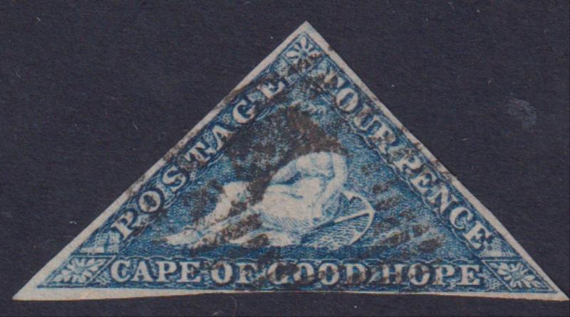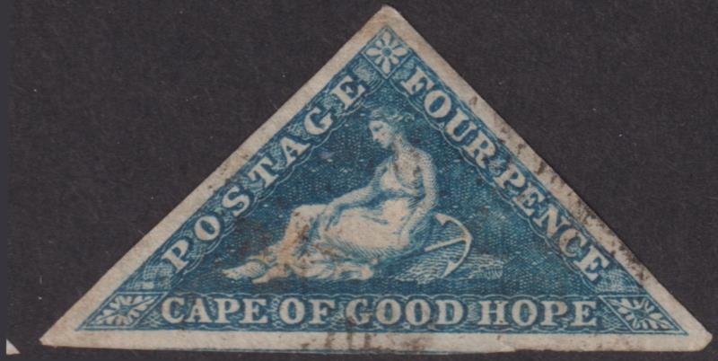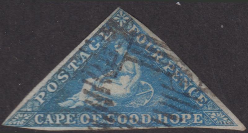2889 U imageCape of Good Hope 1853 4d triangular deep blue, on slightly blued paper, imperf 3 margins (good to large). SG 4. Cat £180. FU. (Image)