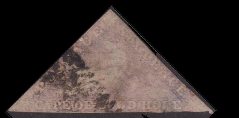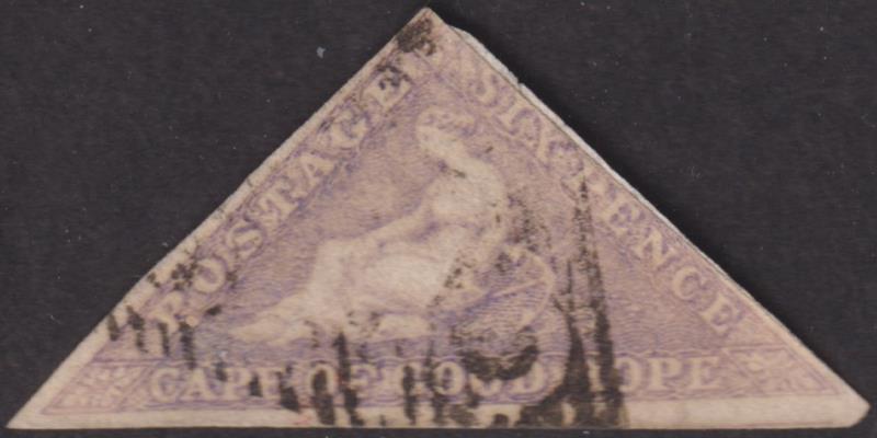 2892 U imageCape of Good Hope 1858 6d triangular pale rose-lilac, imperf 2½ margins, on piece. SG 7. Cat £350. FU. (Image)