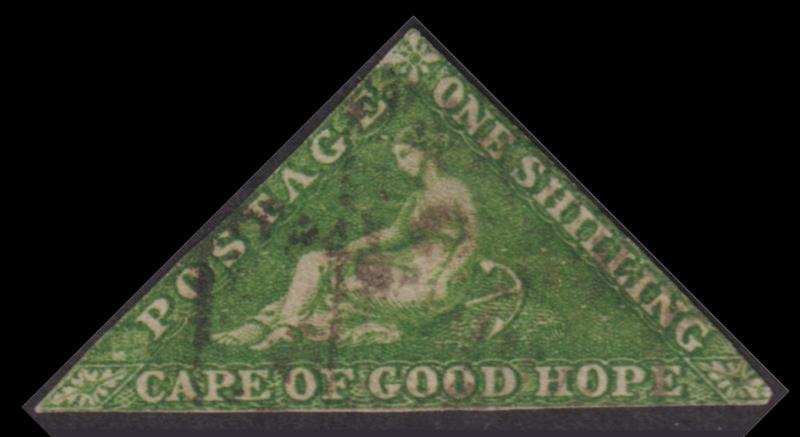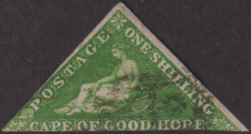 2893 U imageCape of Good Hope 1858 1/- triangular bright yellow-green, imperf (touched on each side). SG 8. Cat £325. FU. (Image)