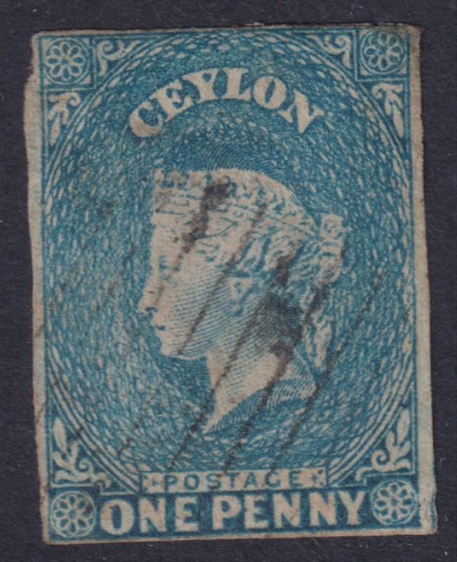 2899 U imageCeylon 1857 1d QV pale turquoise blue, imperf 4 margins, 1 close cut, light barred cancel. SG 2. Cat £45. FU. (Image)