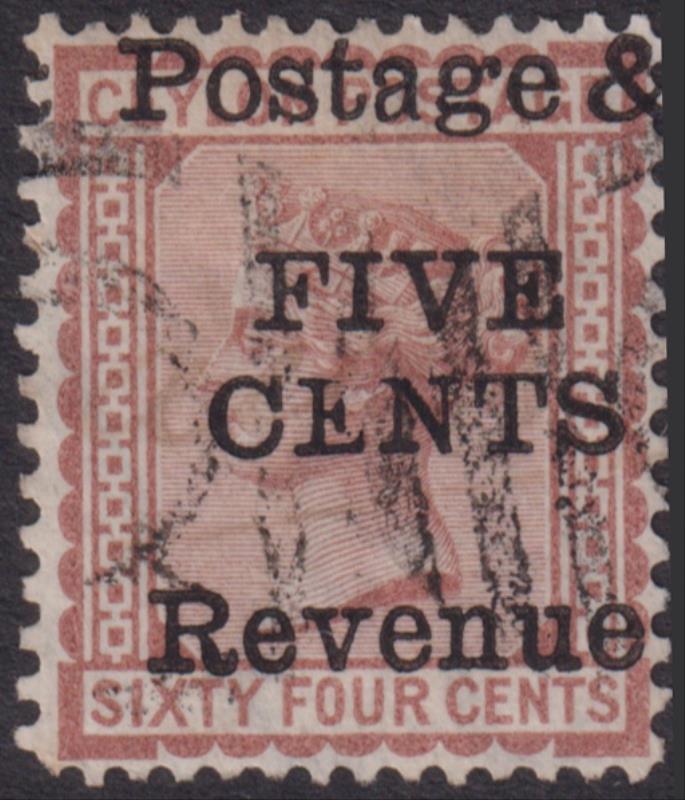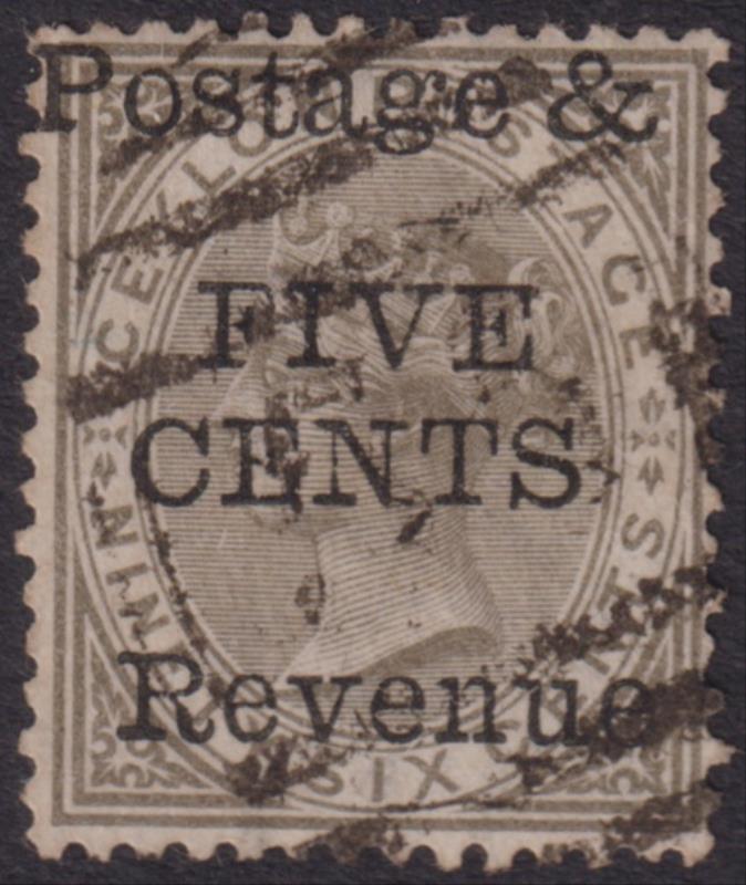Ceylon 1885 5c "Postage & / FIVE / CENTS / Revenue" on 64c QV red-brown, p14 x 12½, crown CC wmk. SG 173. Cat £55. FU. (Image)