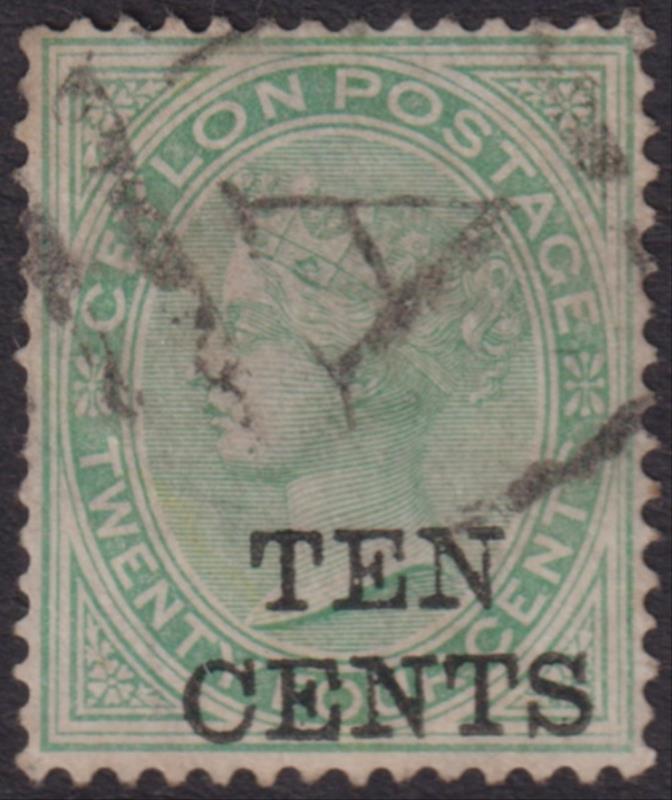 Ceylon 1885 "TEN / CENTS" ovpt on 24c QV dull grey-green, p14, crown CC wmk. Fine "A" barred obliterator cancel. SG 162. Cat